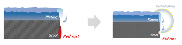 革新后的鍍鎂鋁鋅板在截面產(chǎn)生時,材料上部的鍍鋅層溶解并使截面被覆蓋,促進(jìn)穩(wěn)定的腐蝕生成物的生長。通過增加鍍層內(nèi)的Mg含量(%)及確保與Al含量(%)的最佳平衡,在促成切面部位優(yōu)越的的MgZn2腐蝕生成物增大的同時,也使其更加致密、堅固,進(jìn)而加快耐腐蝕屏障(Self-Healing Zone)生成的速度,因此在自愈效果上與常用的高耐腐蝕鍍鋅鋼板相比,產(chǎn)生了明顯的差異。