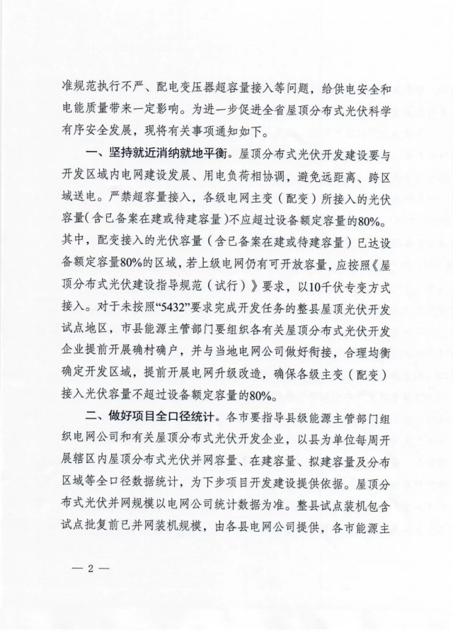 對(duì)于未按照“5432”要求完成開發(fā)任務(wù)的整縣屋頂光伏開發(fā)試點(diǎn)地區(qū),市縣能源主管部門要組織各有關(guān)屋頂分布式光伏開發(fā) 企業(yè)提前開展確村確戶,并與當(dāng)?shù)仉娋W(wǎng)公司做好銜接,合理均衡確定開發(fā)區(qū)域,提前開展電網(wǎng)升級(jí)改造,確保各級(jí)主變(配變)接入光伏容量不超過設(shè)備額定容量的80%。