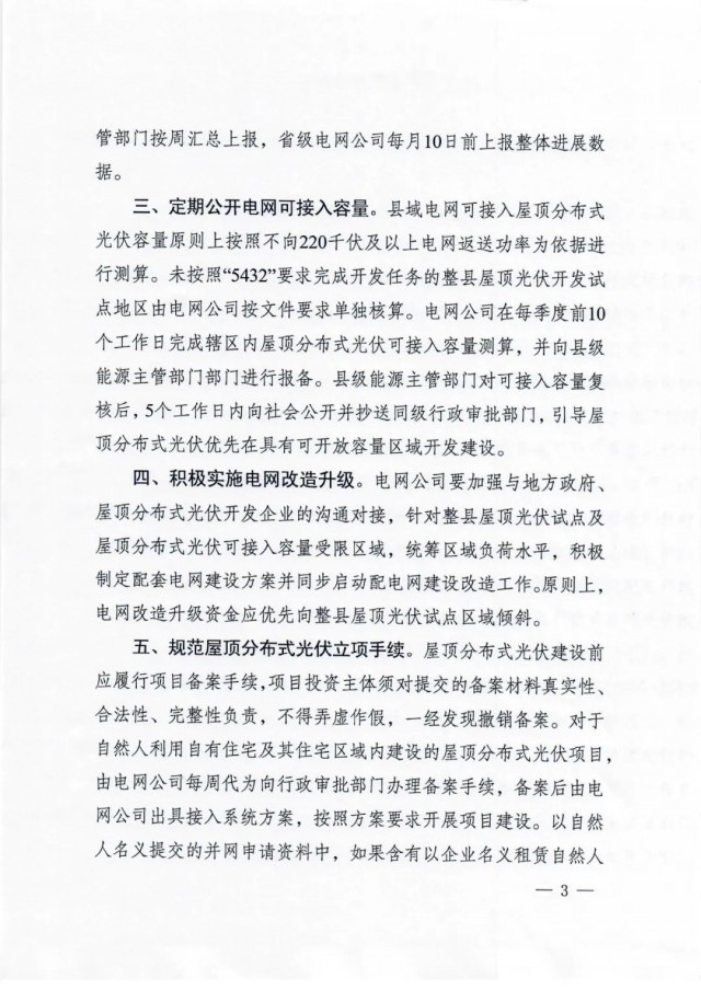 定期公開電網(wǎng)可接入容量??h域電網(wǎng)可接入屋頂分布式 光伏容量原則上按照不向220千伏及以上電網(wǎng)返送功率為依據(jù)進(jìn)行測(cè)算。未按照“5432”要求完成開發(fā)任務(wù)的整縣屋頂光伏開發(fā)試點(diǎn)地區(qū)由電網(wǎng)公司按文件要求單獨(dú)核算。