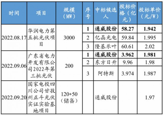 今年8月17日,通威成為華潤電力3GW集采大單第一中標候選人,間隔不到一個月,9月6日,通威又以第一中標候選人中標廣東省電力開發(fā)有限公司將近4億元的組件大單。