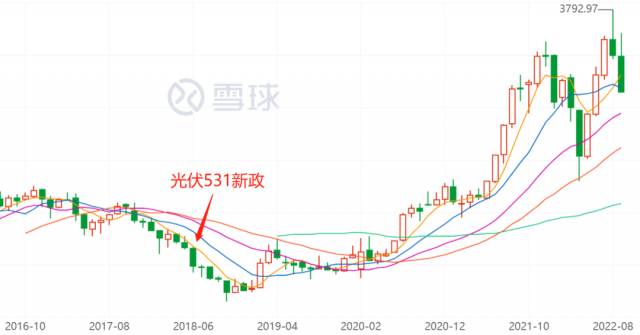 光伏產(chǎn)業(yè)的強勢并非從一而終,最近一次市場記憶猶新的渡劫是,由于發(fā)電成本總是居高不下,在產(chǎn)業(yè)補貼退坡(531新政)后,市場一度對光伏產(chǎn)業(yè)的未來充滿疑慮,上市公司的整體估值跌至歷史低點。