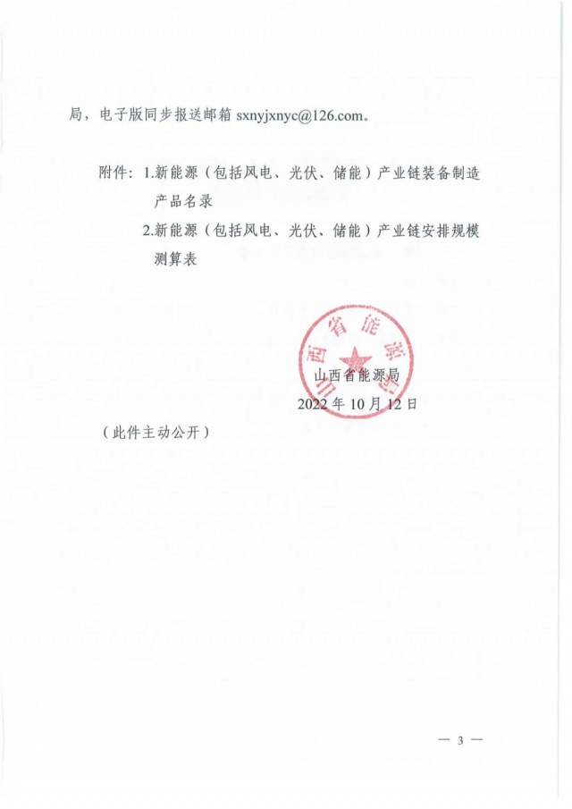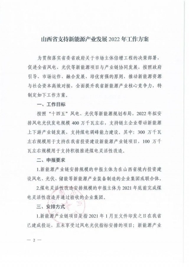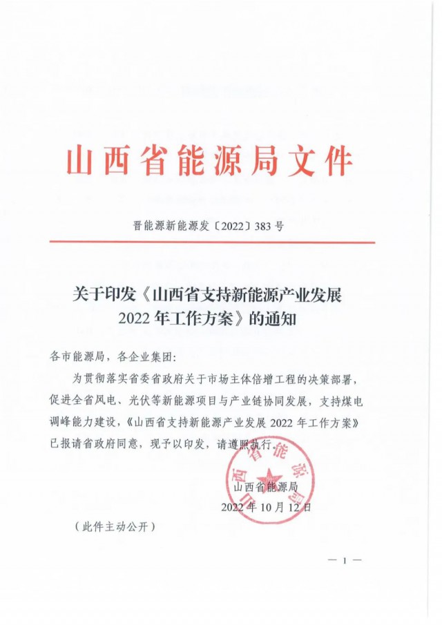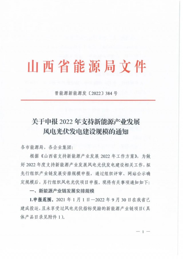 10月12日,山西省能源局印發(fā)《山西省支持新能源產(chǎn)業(yè)發(fā)展2022年工作方案》、《關于申報2022年支持新能源產(chǎn)業(yè)發(fā)展風電光伏發(fā)電建設規(guī)?!返耐ㄖ瑪M先行組織產(chǎn)業(yè)鏈發(fā)展安排規(guī)模申報3GW以及1GW煤電靈活性調(diào)峰改造配套風光項目。