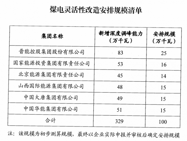 煤電靈活性改造調(diào)峰配套新能源項目的申報范圍則是2021年底前完成改造的煤電機組,安排規(guī)模則是按照新增深度調(diào)峰能力的30%確定。初步測算確定晉能、國家能源集團、京能、山西國際能源、大唐、華能6家企業(yè)獲得1GW煤電改造配套項目,具體仍需以企業(yè)實際申報規(guī)模為準。