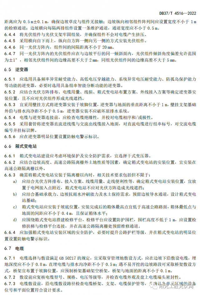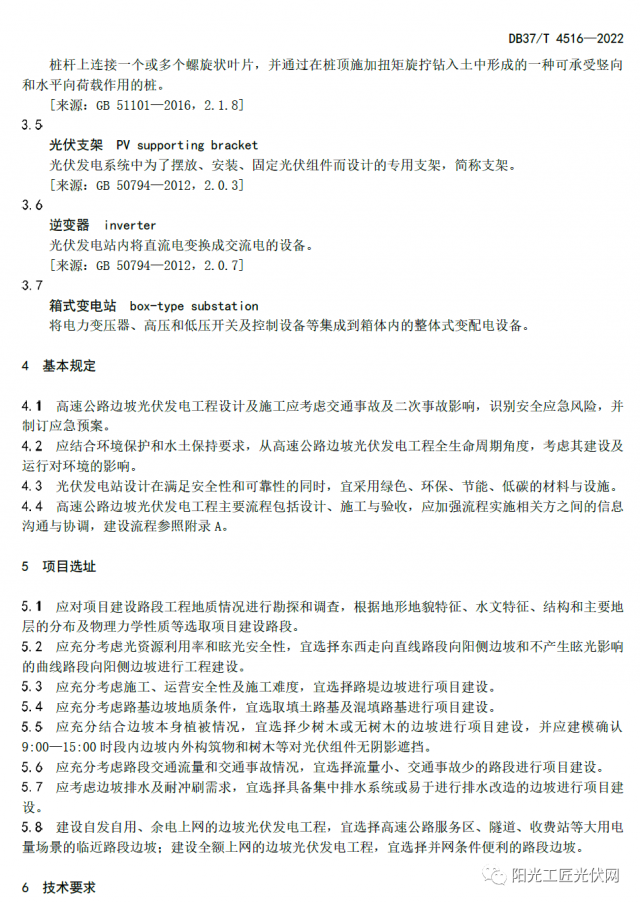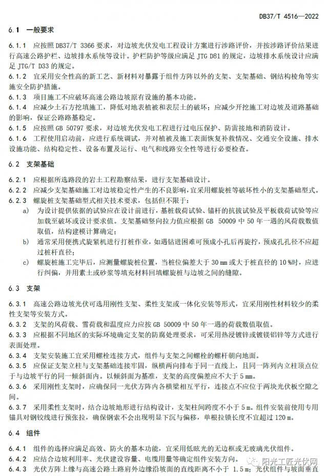 本標(biāo)準(zhǔn)綜合考慮了高速公路行車對(duì)邊坡光伏的技術(shù)要求,具有安全、環(huán)保、美觀、經(jīng)濟(jì)的技術(shù)特點(diǎn)。在安全性上,精心選用了低反光無眩光、防火防水防腐、不易碎、具有自清潔功能的輕質(zhì)柔性光伏組件和帶有自動(dòng)關(guān)斷功能的逆變器,采用柔性支架安裝,組件棱角使用柔性材料包裹,避免影響駕駛安全和二次事故傷害。在環(huán)保性上,設(shè)計(jì)了螺旋樁打孔施工技術(shù),減少對(duì)邊坡草皮的破壞。在美觀性上,注重光伏組件陣列與邊坡斜面外觀上的統(tǒng)一融合,視覺效果美觀、舒適。在經(jīng)濟(jì)性上,最大限度提高邊坡資源利用率,有利于規(guī)模化開發(fā)。