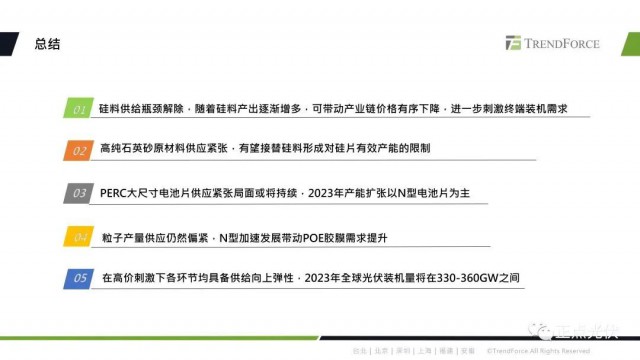 首先對產(chǎn)業(yè)鏈各環(huán)節(jié)2023年的市場量以及光伏裝機(jī)量進(jìn)行預(yù)估。從數(shù)據(jù)上看,2023年硅料整體供應(yīng)充足,不再是制約產(chǎn)業(yè)發(fā)展的瓶頸環(huán)節(jié)。硅片端因?yàn)楦呒兪⑸暗墓?yīng)偏緊,從而造成了坩鍋產(chǎn)出的受限,這也將影響到硅片的實(shí)際產(chǎn)出。電池片環(huán)節(jié)因?yàn)?022年下半年以來,新建產(chǎn)能主要還是以n型技術(shù)為主,新技術(shù)產(chǎn)能釋放具有較大不確定性。PERC的產(chǎn)能擴(kuò)張?zhí)幱谕顟B(tài),2023年大尺寸PERC電池片或?qū)⒊霈F(xiàn)供需緊平衡的狀態(tài)。主要還是關(guān)注TOPCon電池片的實(shí)際產(chǎn)出。膠膜方面,poe粒子目前主要還是依賴進(jìn)口,隨著n型需求的提升,poe粒子的供應(yīng)端也會較為緊張。但是以上各環(huán)節(jié)在較高的資金刺激下,實(shí)際產(chǎn)出都具備了向上的彈性。所以綜合的產(chǎn)業(yè)鏈的實(shí)際產(chǎn)出數(shù)據(jù),我們預(yù)計(jì)2023年全球裝機(jī)量將在330-360GW之間。
