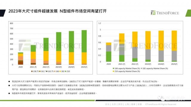 到2023年大尺寸組件產(chǎn)能預(yù)計(jì)575GW,市場占有率達(dá)89%,166及以下尺寸組件產(chǎn)品進(jìn)一步萎縮,隨著市場需求轉(zhuǎn)移,企業(yè)舊產(chǎn)能淘汰升級,166市占比僅為6.5%。大尺寸應(yīng)用場景多元化,地面電站的應(yīng)用主要以大尺寸為主,在分布式中企業(yè)也在推進(jìn)大尺寸的應(yīng)用,以適應(yīng)市場需求。N型組件因?yàn)橄碛邢冗M(jìn)技術(shù)帶來的產(chǎn)品溢價(jià),經(jīng)濟(jì)效益較好,企業(yè)有望加速推進(jìn)。