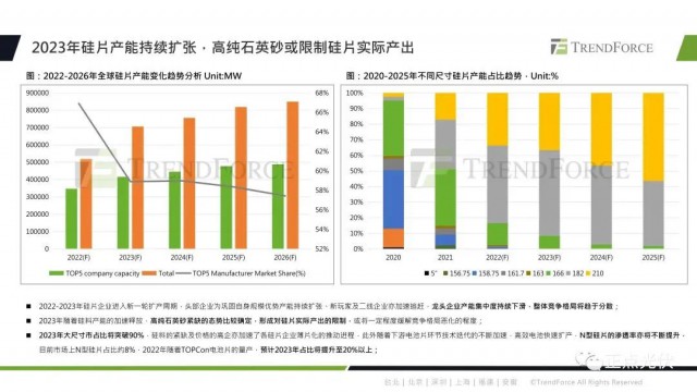 接下來是硅片的產(chǎn)能以及技術(shù)方向。2023年,硅片企業(yè)進(jìn)入了新一輪的擴(kuò)產(chǎn)周期,頭部企業(yè)為了保護(hù)自身規(guī)模優(yōu)勢,產(chǎn)能在持續(xù)擴(kuò)張。新玩家以及二線企業(yè)也在持續(xù)的擴(kuò)張產(chǎn)能,龍頭企業(yè)的產(chǎn)能集中度在持續(xù)的下滑,整體行業(yè)的競爭格局趨于分散。在硅片生產(chǎn)環(huán)節(jié)中需要用到的坩鍋材料、高純石英砂緊缺的態(tài)勢也是比較確定的,這也將對硅片的實(shí)際產(chǎn)出形成限制。但這也在一定程度上緩解了硅片競爭格局的惡化。大尺寸及薄片化也是比較確定的,2023年大尺寸市占比將突破90%,硅料的緊缺以及價(jià)格高企加速了各硅片企業(yè)薄片化的推動進(jìn)程。此外,隨著下游電池片環(huán)節(jié)技術(shù)迭代的不斷加速,n型硅片的滲透率也將不斷提升,目前,n型硅片的總體產(chǎn)量還比較低,占比大約是在8%左右。隨著TOPCon電池片的量產(chǎn),預(yù)計(jì)2023年占比將提升至20%以上。