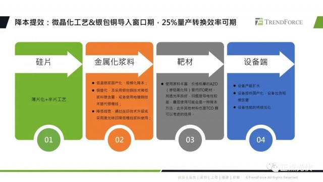 目前HJT技術(shù)降本增效的路徑還是比較確定的,硅片端主要是薄片化以及半片工藝的發(fā)展,金屬化漿料方面,包括低溫銀漿的國產(chǎn)化、規(guī)?;当?銀包銅、電鍍銅上降低銀漿的耗量,靶材價(jià)格以及用量的下降,還有設(shè)備國產(chǎn)化、規(guī)?;当镜确矫?。