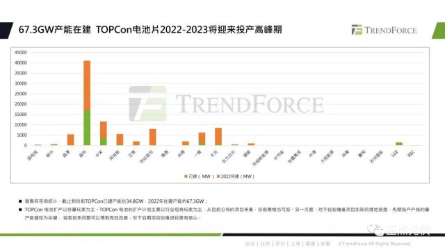 具體來看TOPCon技術(shù)的產(chǎn)能進(jìn)展與效率方面。據(jù)統(tǒng)計(jì),截止到目前,TOPCon的已建產(chǎn)能大約是在34.8GW,2022年再建產(chǎn)能約為67.3GW。從目前公布的項(xiàng)目來看,規(guī)模還是十分可觀的。目前TOPCon電池的擴(kuò)產(chǎn)還是以存量玩家為主,儲備項(xiàng)目前期投產(chǎn)的量產(chǎn)數(shù)據(jù)會比較關(guān)鍵,如果良率方面的問題可以得到有效的改善,后期項(xiàng)目的推進(jìn)將會更有信心。
