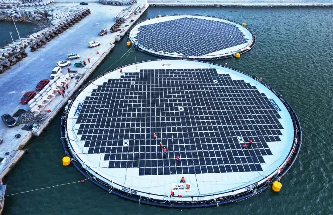 該項目位于山東省海陽市南側(cè)海域,離岸30公里,水深30米。本次建設(shè)的500千瓦漂浮式海上光伏由兩個環(huán)形浮體單元組成,單個浮體單元裝機容量250千瓦,由環(huán)形抗風(fēng)浪浮體、耐海洋環(huán)境的高強薄膜、光伏系統(tǒng)等組成。在直徑53米,面積相當(dāng)于4個標(biāo)準籃球場的浮體單元上,共安裝了770塊光伏組件,其發(fā)出的清潔電能匯流到逆變器后送至同場運行的半島南3號風(fēng)機平臺,后續(xù)將通過海上升壓站送出至電網(wǎng)。