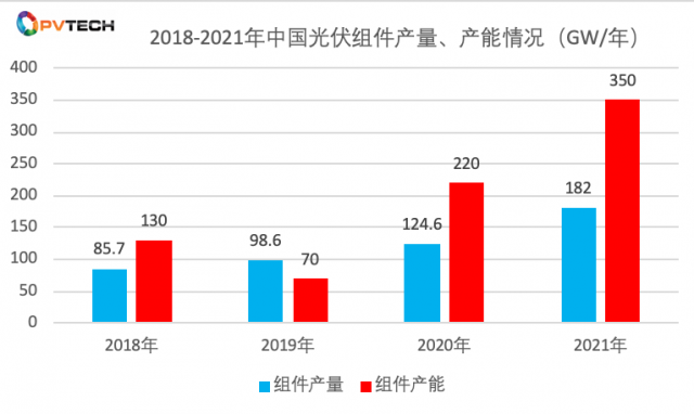 中國光伏行業(yè)協(xié)會(huì)(CPIA)數(shù)據(jù)顯示,2021年中國光伏組件產(chǎn)能為350 GW/年,同比增59.09%;該年實(shí)際組件產(chǎn)量為182GW,同比2020年增46.07%。