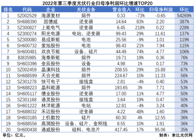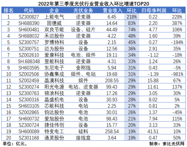 從環(huán)比增速來看,逆變器環(huán)節(jié)受益于歐洲戶用儲(chǔ)能市場(chǎng)的全面爆發(fā),第三季度經(jīng)營業(yè)績(jī)持續(xù)攀升。其中,上能電氣營收和歸母凈利潤(rùn)環(huán)比增速高達(dá)218%和228%;固德威達(dá)到83%和387%;陽光電源為29%和137%。