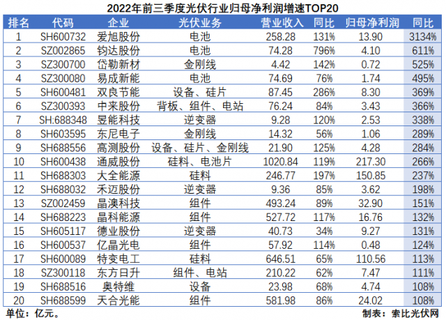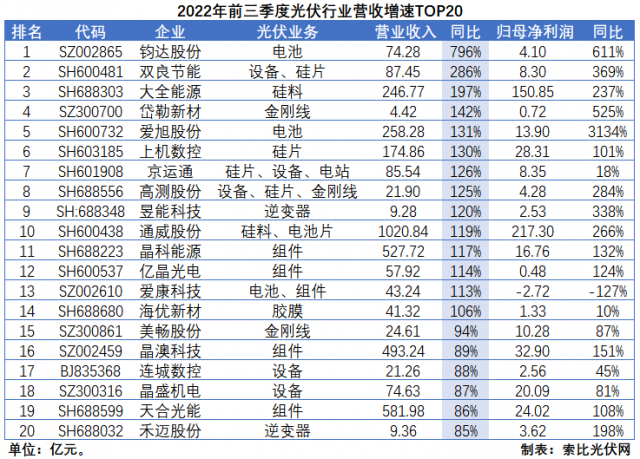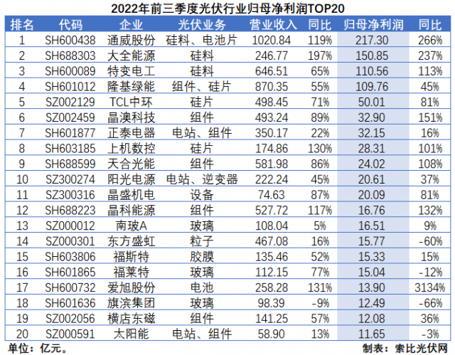 從營收規(guī)模來看,硅料和組件依然是創(chuàng)收能力最強(qiáng)的環(huán)節(jié)。而且,多數(shù)企業(yè)前三季度營業(yè)收入均已超過2021年全年,且創(chuàng)歷史新高。其中,通威股份營收規(guī)模首次突破千億大關(guān),達(dá)到1021億元;隆基綠能二、三季度邊際改善顯著,環(huán)比增速分別達(dá)到71%和15%,營收規(guī)模達(dá)到870.35億元;特變電工受益于硅料、煤炭產(chǎn)品的“量?jī)r(jià)齊升”,達(dá)到646.51億元。