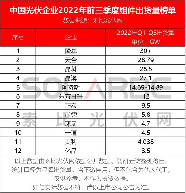經(jīng)過索比光伏網(wǎng)多次調(diào)研走訪,結(jié)合相關(guān)企業(yè)財(cái)報(bào)、投資者活動(dòng)記錄、招投標(biāo)信息等,我們整理了中國光伏企業(yè)2022年前三季度組件出貨量榜單,詳情如下:
