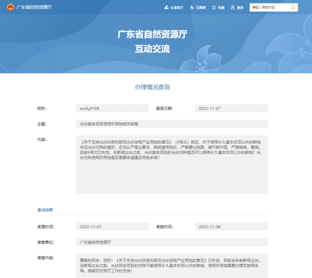 11月8日,廣東省自然資源廳公布了網(wǎng)友提問光伏復合項目使用農(nóng)用地相關政策的問題,并作出回答,詳情如下: