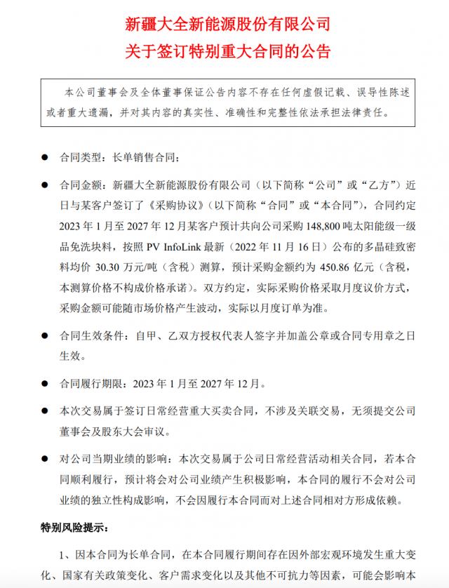 11月21日,大全能源(688303.SH)公告稱,與某客·戶簽訂《采購(gòu)協(xié)議》,合同約定2023年1月至2027年12月某客戶預(yù)計(jì)采購(gòu)148,800噸太陽(yáng)能級(jí)一級(jí)品免洗塊料,按照PVInfolink最新公布的多晶硅致密料均價(jià)30.30萬(wàn)元/噸(含稅)測(cè)算,預(yù)計(jì)采購(gòu)金額約為450.86億元。