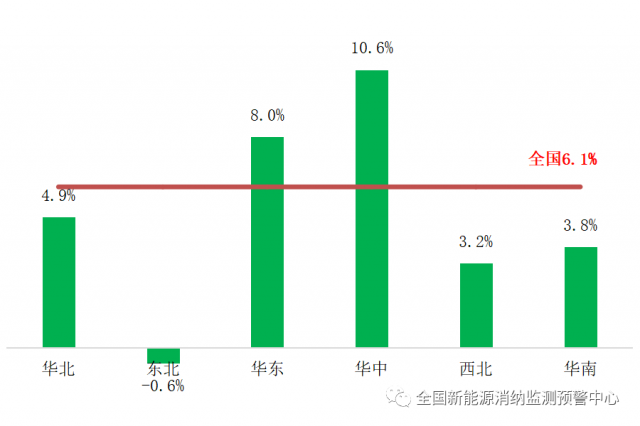 其中,三季度全國全社會用電量達到2.39萬億千瓦時,同比增長6.1%。三季度在穩(wěn)經濟政策措施逐步落地以及持續(xù)大范圍極端高溫天氣等因素拉動下,用電量增速比二季度明顯回升,為新能源消納創(chuàng)造了良好條件。其中,7-8月全社會用電量增速較快,同比分別增長6.25%和10.7%,9月全社會用電量與去年同期持平。分地區(qū)來看,華中、華東地區(qū)三季度用電增速高于全國平均水平。