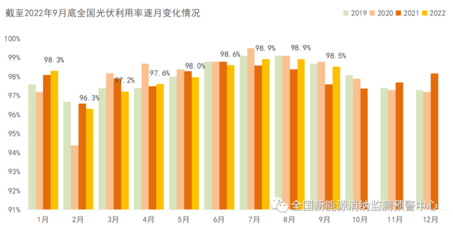 三季度全國新能源消納利用整體處于合理水平。風電利用率為98%,同比下降0.3個百分點;光伏利用率為99%,同比上升0.8個百分點。今年前三季度,風電累計利用率為96.5%,同比下降0.5個百分點;光伏利用率為98.2%,同比上升0.17個百分點。