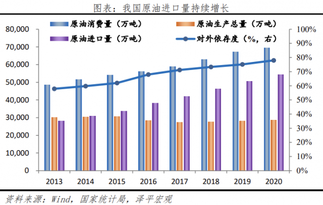 二是對國家能源安全的保障。在交通運輸領(lǐng)域,我國石油消費量正不斷走高,從2015年的5.43億噸/年上升至2020年的7.36億噸/年。然而我國原油產(chǎn)量則一直維持在2億噸/年。供需矛盾致使我國的原油進口量持續(xù)增長,對外依存度超過70%。為保證國家的能源安全和經(jīng)濟的可持續(xù)發(fā)展,能源消費結(jié)構(gòu)亟需升級。而發(fā)展新能源發(fā)電有利于減少我國對能源進口的依賴,保障國家能源安全。