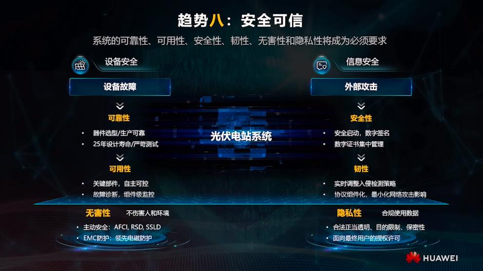 華為此次重磅發(fā)布涵蓋智能光儲發(fā)電機、組串式儲能、電芯級精細管理、安全可信、全面數(shù)字化、AI增效等在內(nèi)的十大趨勢,展望和引領(lǐng)光伏行業(yè)的未來發(fā)展趨勢,通過技術(shù)創(chuàng)新實現(xiàn)電網(wǎng)增強、安全可靠、高效運維等,推動光伏成為未來的主力能源。
