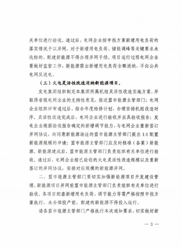 發(fā)電集團(tuán)組織制定本集團(tuán)所屬機(jī)組靈活性改造實(shí)施方案,并取得省級(jí)電網(wǎng)企業(yè)的支持性意見,報(bào)送盟市能源主管部門:電網(wǎng)企業(yè)組織評(píng)審?fù)ㄟ^(guò)后,結(jié)合年度檢修計(jì)劃,合理安排機(jī)組改造時(shí)序。靈活性改造完成后,電網(wǎng)企業(yè)進(jìn)行驗(yàn)收并出具驗(yàn)收?qǐng)?bào)告:發(fā)電企業(yè)根據(jù)驗(yàn)收?qǐng)?bào)告確定的新增調(diào)節(jié)能力,與電網(wǎng)企業(yè)重新簽訂并網(wǎng)協(xié)議,向同意新能源場(chǎng)址的盟市能源主管部門提出 1:1 配置新能源規(guī)模的申請(qǐng);盟市能源主管部門應(yīng)及時(shí)核準(zhǔn)(備案)新能源。新能源建成后,盟市能源主管部門負(fù)責(zé)組織有關(guān)單位進(jìn)行驗(yàn)收。通過(guò)后,電網(wǎng)企業(yè)按已驗(yàn)收的火電靈活性改造規(guī)模以及重新簽訂的并網(wǎng)協(xié)議,安排對(duì)應(yīng)規(guī)模的新能源并網(wǎng)。