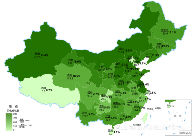 截至9月底累計風電發(fā)電量(億千瓦時)及占本地區(qū)總發(fā)電量比重