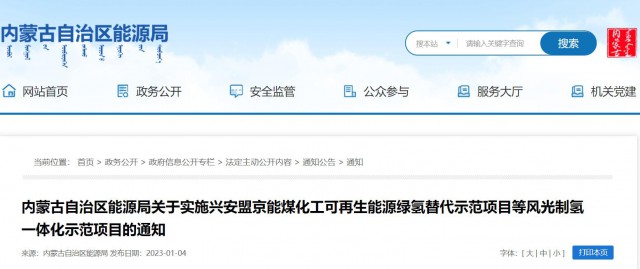 1月4日,內(nèi)蒙古能源局官網(wǎng)發(fā)布“內(nèi)蒙古自治區(qū)能源局關(guān)于實施興安盟京能煤化工可再生能源綠氫替代示范項目等風光制氫一體化示范項目的通知”。