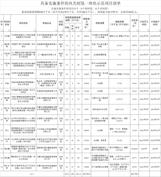 通知顯示:按照《內(nèi)蒙古自治區(qū)人民政府辦公廳關(guān)于促進氫能產(chǎn)業(yè)高質(zhì)量發(fā)展的意見》和《內(nèi)蒙古自治區(qū)風光制氫一體化示范項目實施細則(2022年版)》有關(guān)要求,經(jīng)自治區(qū)人民政府同意,計劃實施興安盟京能煤化工可再生能源綠氫替代示范項目等15個風光制氫一體化示范項目。具備實施條件的項目15個(4個離網(wǎng)型,11個并網(wǎng)型),配套新能源規(guī)模631.2萬千瓦(其中風電473.2萬千瓦,光伏158萬千瓦),制氫能力28.2萬噸/年,總投資495.8億元。