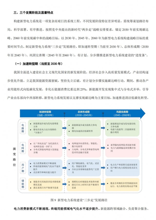 按照黨中央提出的新時代“兩步走”戰(zhàn)略安排要求,錨定2030年前實現(xiàn)碳達峰、2060年前實現(xiàn)碳中和的戰(zhàn)略目標,以2030年、2045年、2060年為新型電力系統(tǒng)構(gòu)建戰(zhàn)略目標的重要時間節(jié)點,制定新型電力系統(tǒng)“三步走”發(fā)展路徑,即加速轉(zhuǎn)型期(當前至2030年)、總體形成期(2030年至2045年)、鞏固完善期(2045年至2060年),有計劃、分步驟推進新型電力系統(tǒng)建設的“進度條”。