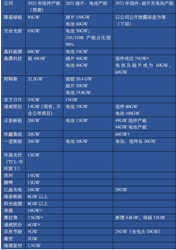 主要組件廠商產(chǎn)能數(shù)據(jù)(未列入純電池、純硅片廠商)