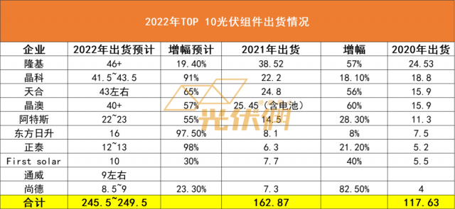 市場(chǎng)規(guī)模刷新紀(jì)錄的同時(shí),龍頭企業(yè)組件出貨規(guī)模也在快速攀升。近日,光伏們通過企業(yè)內(nèi)部咨詢、第三方統(tǒng)計(jì)機(jī)構(gòu)以及券商公開資料統(tǒng)計(jì)了2022年TOP 10組件出貨情況,10家企業(yè)合計(jì)出貨規(guī)模約為250GW,其中,前四家組件企業(yè)的出貨數(shù)據(jù)愈發(fā)膠著,排名爭(zhēng)奪戰(zhàn)一觸即發(fā)。