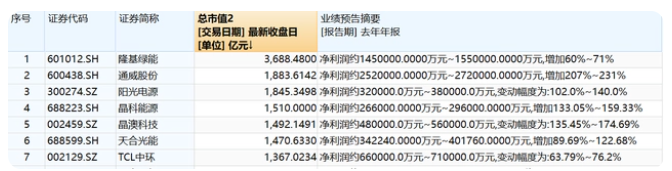 7家千億光伏股,隆基綠能(601012.SH)、通威股份(600438.SH)、陽(yáng)光電源(300274.SZ)、晶澳科技(002459.SZ)、晶科能源(688223.SH)、天合光能(688599.SH)、TCL中環(huán)(002129.SZ)2022年業(yè)績(jī)均為預(yù)增。