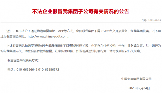 2月24日,大唐集團(tuán)公告稱,有不法分子通過(guò)偽造網(wǎng)頁(yè)網(wǎng)址、APP等方式,企圖以大唐集團(tuán)下屬子公司名義開(kāi)展業(yè)務(wù)。以下為公告原文: