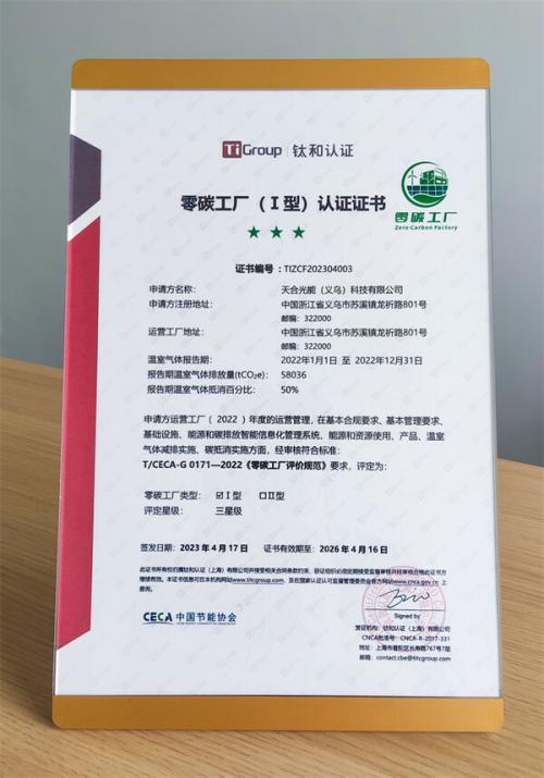 義烏2023年7月6日/美通社/ --近日,天合光能(義烏)科技有限公司在中國節(jié)能協(xié)會組織的“首屆中國碳金融論壇”上獲得了由鈦和認證集團頒發(fā)的2022年度零碳工廠(Ⅰ型)證書,成為光伏行業(yè)首家經(jīng)權(quán)威機構(gòu)認證的零碳工廠。該認證不僅展示了天合光能既往25年可持續(xù)發(fā)展的卓越成就,更體現(xiàn)天合支撐綠色發(fā)展理念的技術(shù)、產(chǎn)品、設(shè)備、流程管理全維度的零碳實踐,引領(lǐng)行業(yè)綠色發(fā)展,加速全行業(yè)節(jié)能減排步伐。該認證得到中國節(jié)能協(xié)會認可,可在國家認證認可監(jiān)督管理委員會官網(wǎng)查詢。