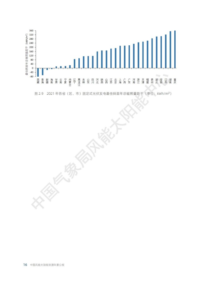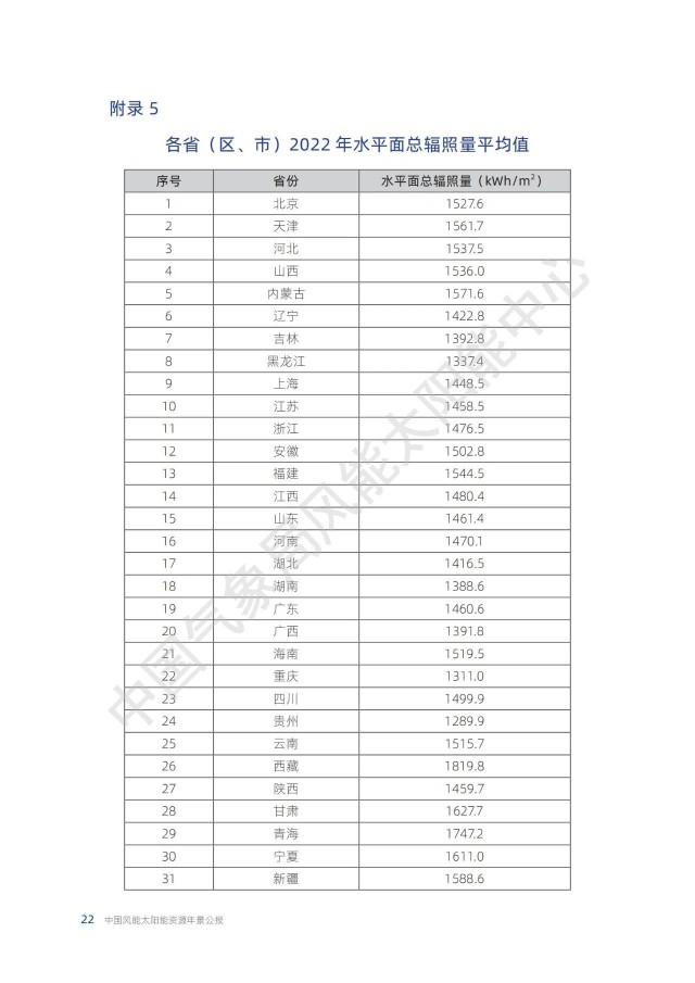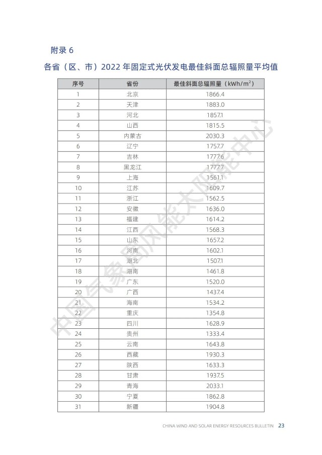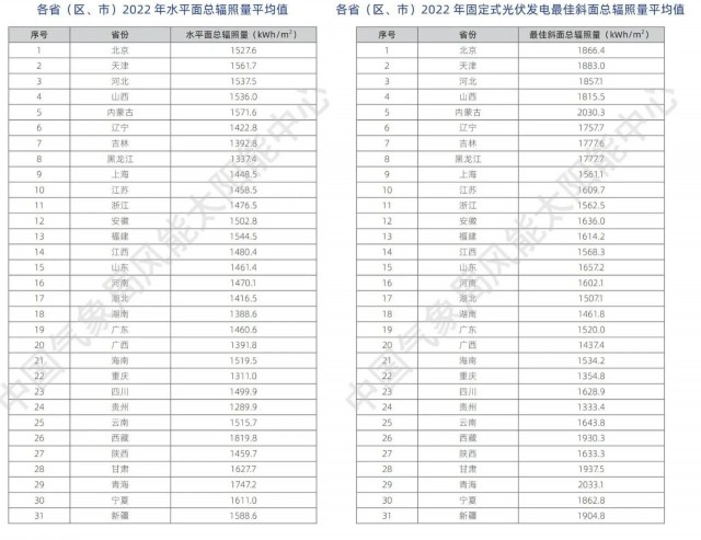 上圖為全國平均值,具體到各個省份的年水平面總輻射量、年傾斜面面總輻射量數(shù)值如下表所示。