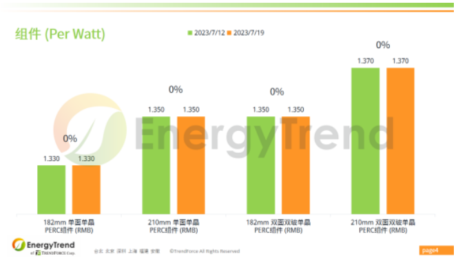 182mm 單面單晶PERC組件價格為 RMB1.33/W;210mm 單面單晶PERC組件報價為 RMB1.35/W;182mm 雙面雙玻單晶PERC組件最新報價為 RMB1.35/W;210mm 雙面雙玻單晶PERC組件報價為 RMB1.37/W。