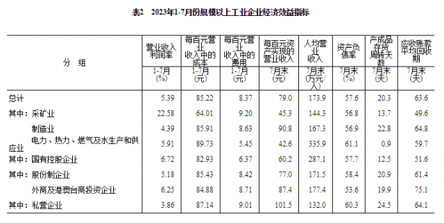 1—7月份,規(guī)模以上工業(yè)企業(yè)實現(xiàn)營業(yè)收入73.22萬億元,同比下降0.5%;發(fā)生營業(yè)成本62.40萬億元,增長0.2%;營業(yè)收入利潤率為5.39%,同比下降0.95個百分點。