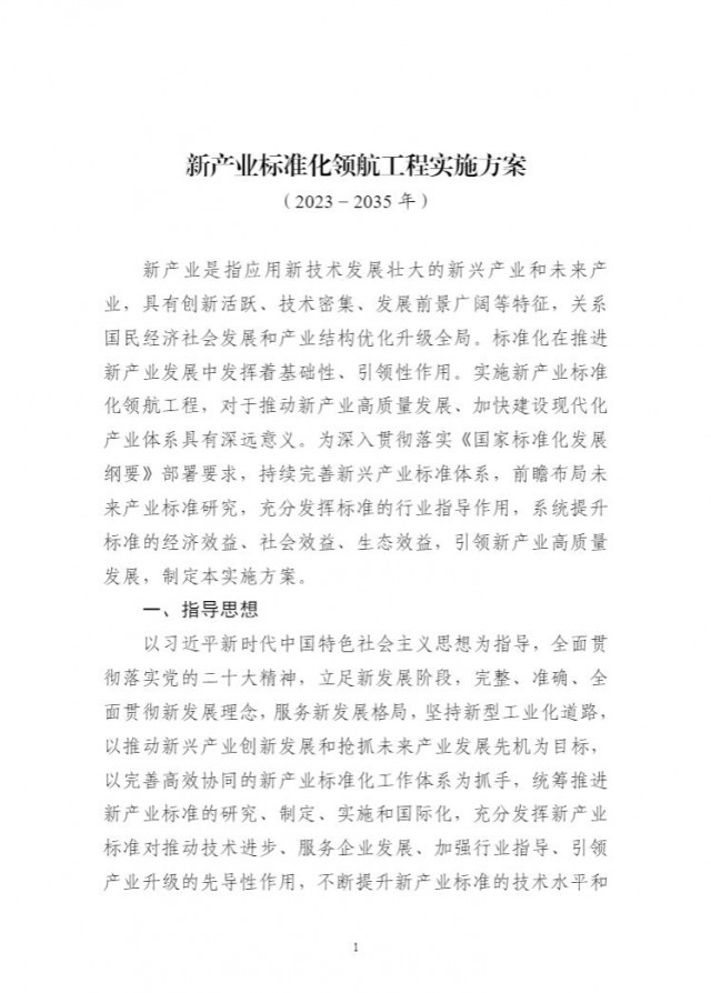 為貫徹落實《國家標準化發(fā)展綱要》,持續(xù)完善新興產業(yè)標準體系建設,前瞻布局未來產業(yè)標準研究,充分發(fā)揮標準的行業(yè)指導作用,引領新產業(yè)高質量發(fā)展,工業(yè)和信息化部、科技部、國家能源局、國家標準化管理委員會組織編制了《新產業(yè)標準化領航工程實施方案(2023─2035年)》?,F印發(fā)你們,請結合本地區(qū)、本行業(yè)實際,抓好貫徹落實。