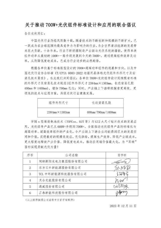 12月11日阿特斯陽光電力集團、東方日升、TCL中環(huán)、天合光能、通威股份、正泰新能等公司發(fā)布聯(lián)合倡議,推動700W+光伏組件標準設(shè)計和應(yīng)用。倡議提出,各單位700W+光伏組件設(shè)計延續(xù)既有標準的外形尺寸及安裝孔技術(shù)規(guī)范(組件外形尺寸2384mm×1303mm,長邊安裝孔距400mm和1400mm),增加790mm孔位;同時,產(chǎn)業(yè)鏈上下游積極探索更高效、更領(lǐng)先的技術(shù)與應(yīng)用方案,共促光伏行業(yè)健康發(fā)展。