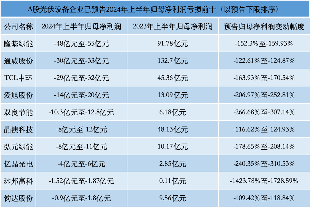 iFinD數(shù)據(jù)顯示,截至7月16日,在申銀萬(wàn)國(guó)光伏設(shè)備行業(yè)分類的64家上市公司中,已有22家預(yù)披露了2024年上半年業(yè)績(jī)。其中,9家企業(yè)實(shí)現(xiàn)盈利,占比不足五成;18家企業(yè)歸母凈利潤(rùn)同比下滑,占比超過八成。值得注意的是,在虧損前十的榜單中,包括通威股份、隆基綠能、TCL中環(huán)等在內(nèi)的頭部企業(yè)占據(jù)多數(shù)。