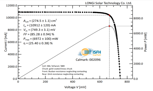 3月31日,繼3月29日宣布p-HJT 以25.47%打破世紀(jì)紀(jì)錄后,經(jīng)德國哈梅林太陽能研究所(ISFH)認(rèn)證,隆基研發(fā)團(tuán)隊(duì)在M6全尺寸(274.5cm2)單晶硅片上創(chuàng)造了無銦HJT電池25.40%轉(zhuǎn)換效率的新世界紀(jì)錄,持續(xù)夯實(shí)HJT電池低成本技術(shù)路線的產(chǎn)業(yè)化基礎(chǔ)。