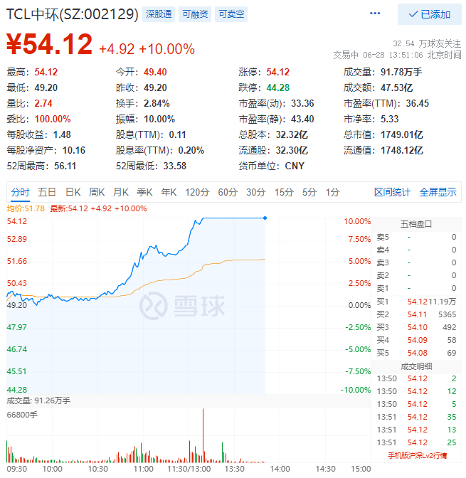 TCL中環(huán)午后強(qiáng)勢(shì)漲停,股價(jià)逼近歷史新高!