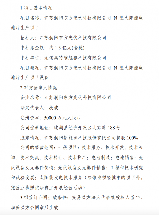 奧特維公司控股子公司中標(biāo)潤(rùn)陽(yáng)東方光伏科技N型電池片生產(chǎn)項(xiàng)目,中標(biāo)金額約1.3億元。