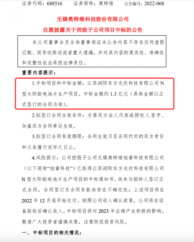 近日,奧特維公告稱,公司控股子公司無(wú)錫奧特維旭??萍加邢薰疽讶〉媒K潤(rùn)陽(yáng)東方光伏科技有限公司N型太陽(yáng)能電池片生產(chǎn)項(xiàng)目的中標(biāo)通知書,上述項(xiàng)目將在2022年12月底開始交付。中標(biāo)金額約1.3億元。