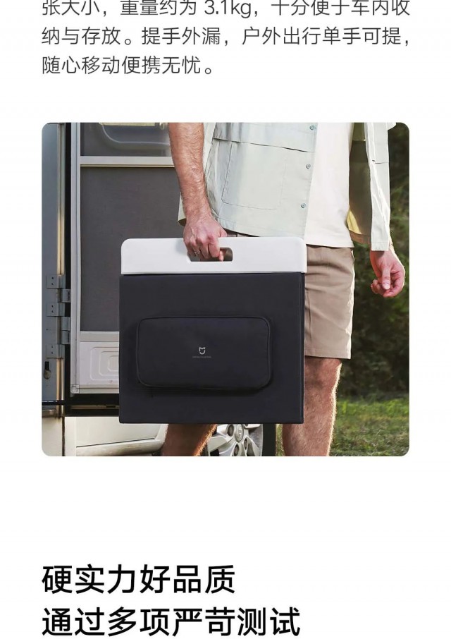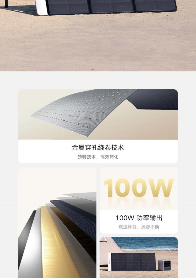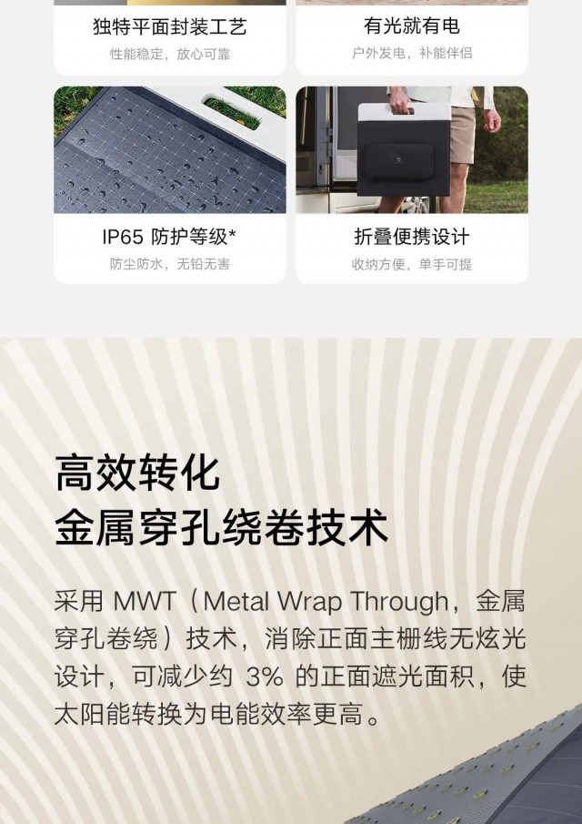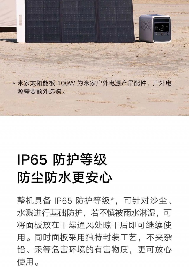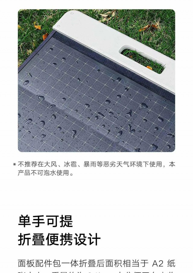 此外,米家太陽(yáng)能板100W整機(jī)具備IP65防護(hù)等級(jí),可針對(duì)沙塵、水濺等進(jìn)行基礎(chǔ)防護(hù)。面板配件包一體折疊后面積相當(dāng)于A2紙張大小,重量約為3.1kg,十分便于車內(nèi)收納與存放。提手外漏設(shè)計(jì),戶外出行單手可提,隨心移動(dòng)便攜無(wú)憂。