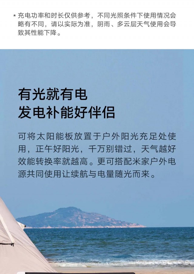 米家太陽(yáng)能板100W擁有最高100W MAX大功率,可搭配戶外電源進(jìn)行快速補(bǔ)能,同時(shí)支持邊曬邊充,戶外有光就有電。
