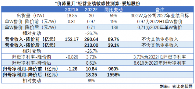 首先來看愛旭股份,假設(shè)2022年電池片單W售價下降至2020年的水平,同時盈利能力恢復(fù)至同期水平,按照全年出貨30GW計算,則營收規(guī)模相比于降價前下降27%,營收增速由89.7%下降至39.1%。不過,受益于盈利能力的修復(fù),經(jīng)營業(yè)績暴增1556%,相較于降價前的960%大幅提升。