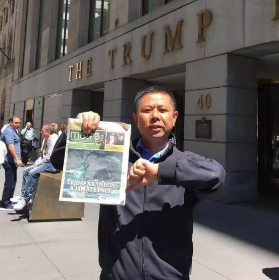 2017年,在特朗普宣布退出巴黎氣候協(xié)定的第二天,憤怒的高紀(jì)凡便一個人跑到紐約特朗普大廈門前,右手拿著剛剛印出來的報紙,左手大拇指朝下,抗議的同時還不忘招賢納士:歡迎全球致力于低碳技術(shù)創(chuàng)新的人到中國發(fā)展。
