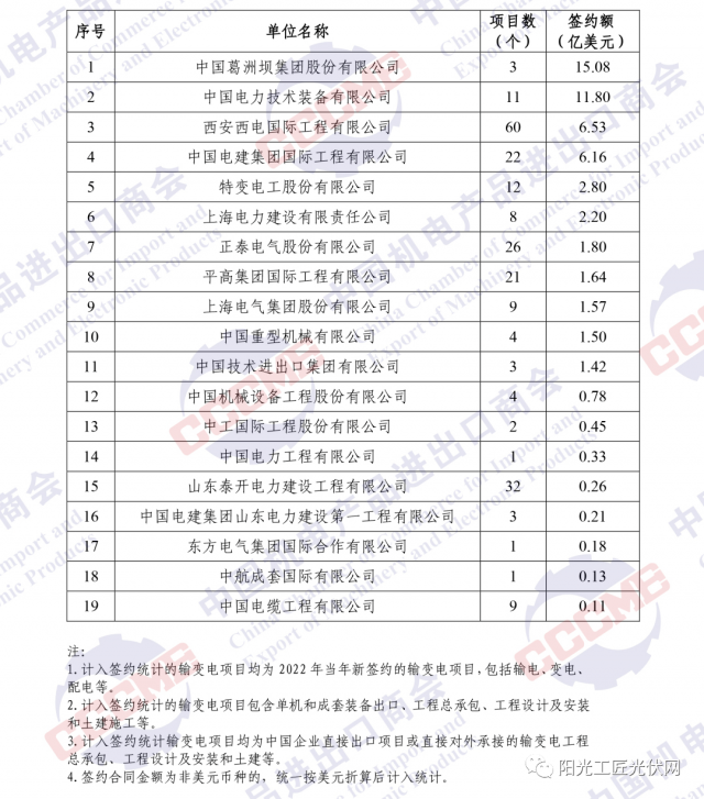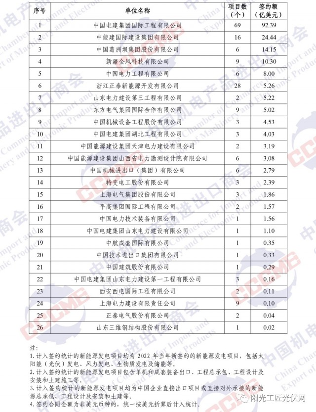 根據(jù)各重點(diǎn)企業(yè)報(bào)送的2022年境外電力項(xiàng)目的新簽約情況,中國機(jī)電商會(huì)對(duì)企業(yè)簽約額進(jìn)行了排名?,F(xiàn)將企業(yè)排名及火電、水電、輸變電、新能源(太陽能、風(fēng)、生物質(zhì)、儲(chǔ)能等)及太陽能(光伏)、風(fēng)電行業(yè)簽約排名予以發(fā)布。