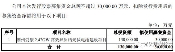 4月24日,愛(ài)康科技發(fā)布公告稱,公司擬向特定對(duì)象發(fā)行股票募資不超過(guò)3億元,扣除相關(guān)發(fā)行費(fèi)用后用于湖州愛(ài)康2.42GW高效異質(zhì)結(jié)光伏電池建設(shè)項(xiàng)目。